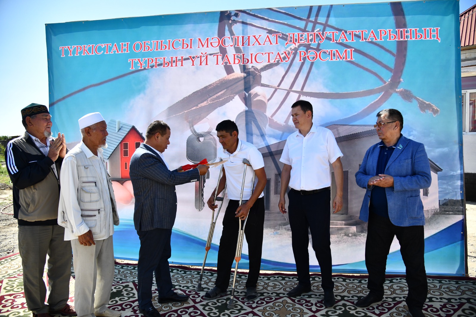 Үйді арнайы табыстауға облыстық мәслихат депутаттары А.Салимов, Е.Хандиллаев және Отырар ауданының әкімі Қ.Жолдыбай келіп, кілтті табыстады.