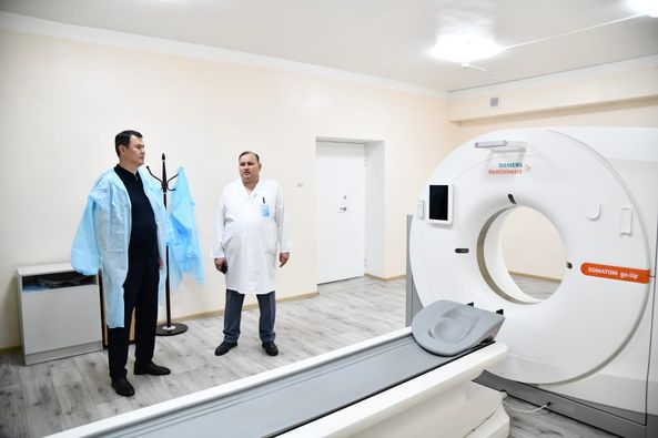 Мұнан соң аудан әкімі аудандық орталық ауруханада болып, ем алушыларға көрсетілетін стационарлық қызмет сапасын жақсарту жұмыстарымен танысты. Аудандық орталық аурухана тәулік бойы жұмыс атқаратын 171 және күндізгі стационарда 145 төсек орыны бар. Оның ішінде терапия бөлімі 40, балалар бөлімі 22, перзентхана бөлімі 15, гинекология бөлімі 8, хирургия бөлімі 14, жұқпалы аурулар бөлімі 25, оңалту бөлімі 21 төсек орынымен қамтылған. Ем алушыларға 118 дәрігер, 386 медицина қызметкерлері қызмет көрсетеді. Ем алу бөлімдері заманауи медициналық құралдармен жабдықталған.