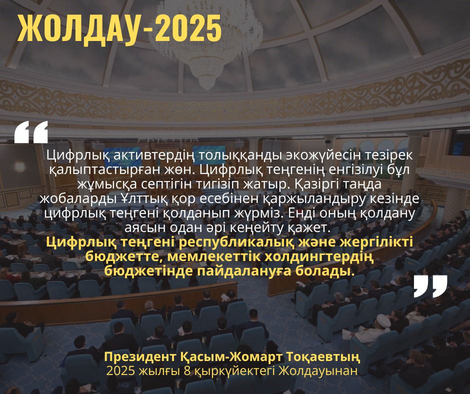 Сонымен қатар, Жолдауда цифрлық теңгені енгізу және оның мемлекеттік қаржыларда қолдану аясын кеңейту мәселесі қаралды. Президент цифрлық активтер экожүйесін жедел қалыптастыру, цифрлық теңгенің тиімділігін арттыру және оның ұлттық қор, республикалық және жергілікті бюджеттік жобаларда қолданылуын қамтамасыз етуді тапсырды.